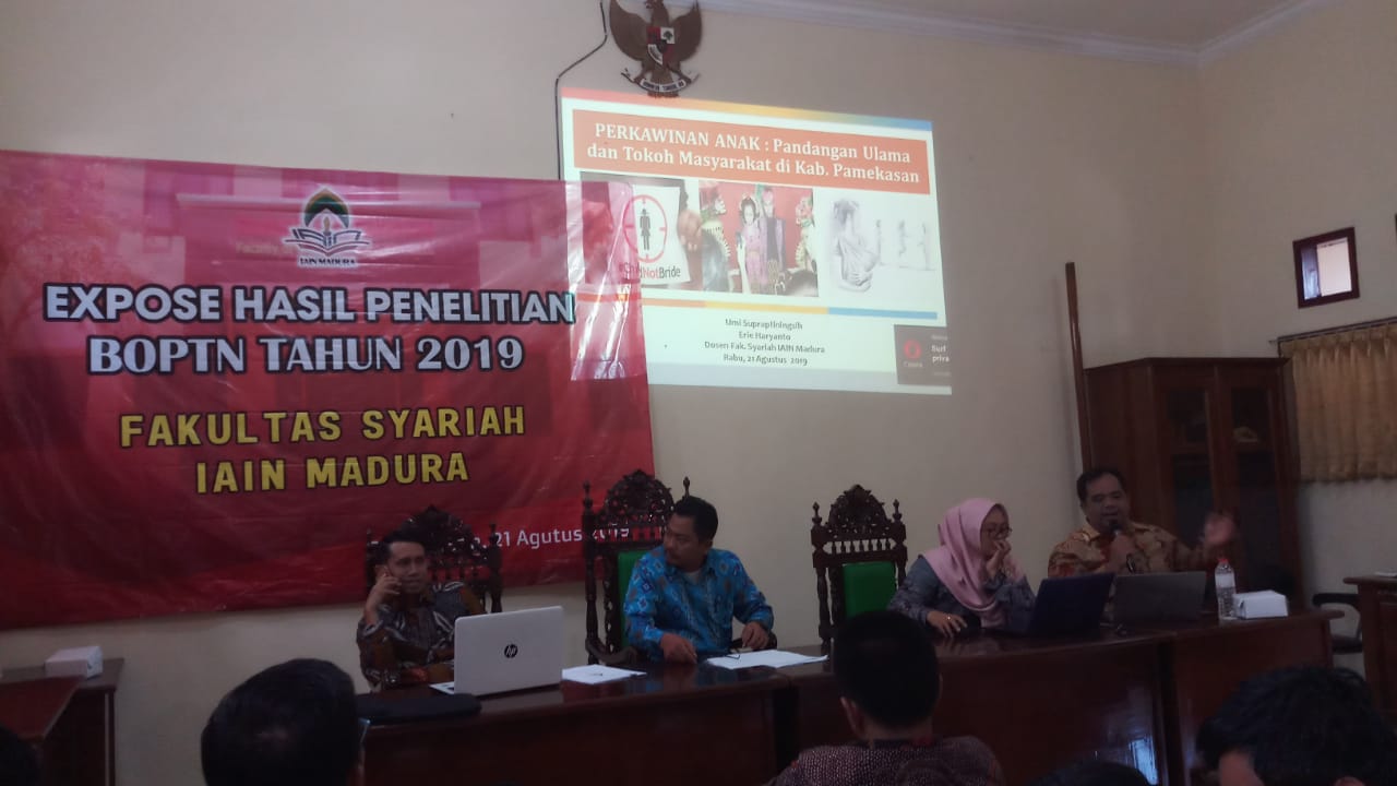 (Pamekasan,21/08/2019) Bertempat di ruang laboratorium peradilan semu fakultas syari’ah IAIN Madura, beberapa dosen fakultas syari’ah menggelar ekspos hasil penelitiannya. Selain para peneliti, pada kesempatan ini juga dihadiri oleh sejumlah dosen fakultas syari’ah dari dua program studi, yakni Dosen Hukum Ekonomi Syari’ah (HES) dan Dosen Hukum Keluarga Islam (HKI).